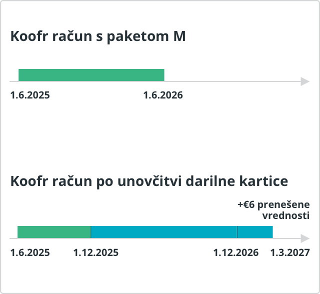 Primer: uporabnica je aktivirala paket M (vrednost 12€) na dan 1. junija, nato pa je unovčila darilno kartico za paket L na dan 1. decembra, torej šest mesecev kasneje. Od predhodnega paketa je ostala natanko polovica neporabljene vrednosti v višini €6. Ta preostanek se prenese na novi paket, kateremu podaljšamo veljavnost v sorazmerju s preneseno vrednostjo. V tem primeru predstavlja 6€ ravno 25% polne cene paketa L (ki znaša €24), tako da veljavnost novega paketa podaljšamo za točno tri mesece.